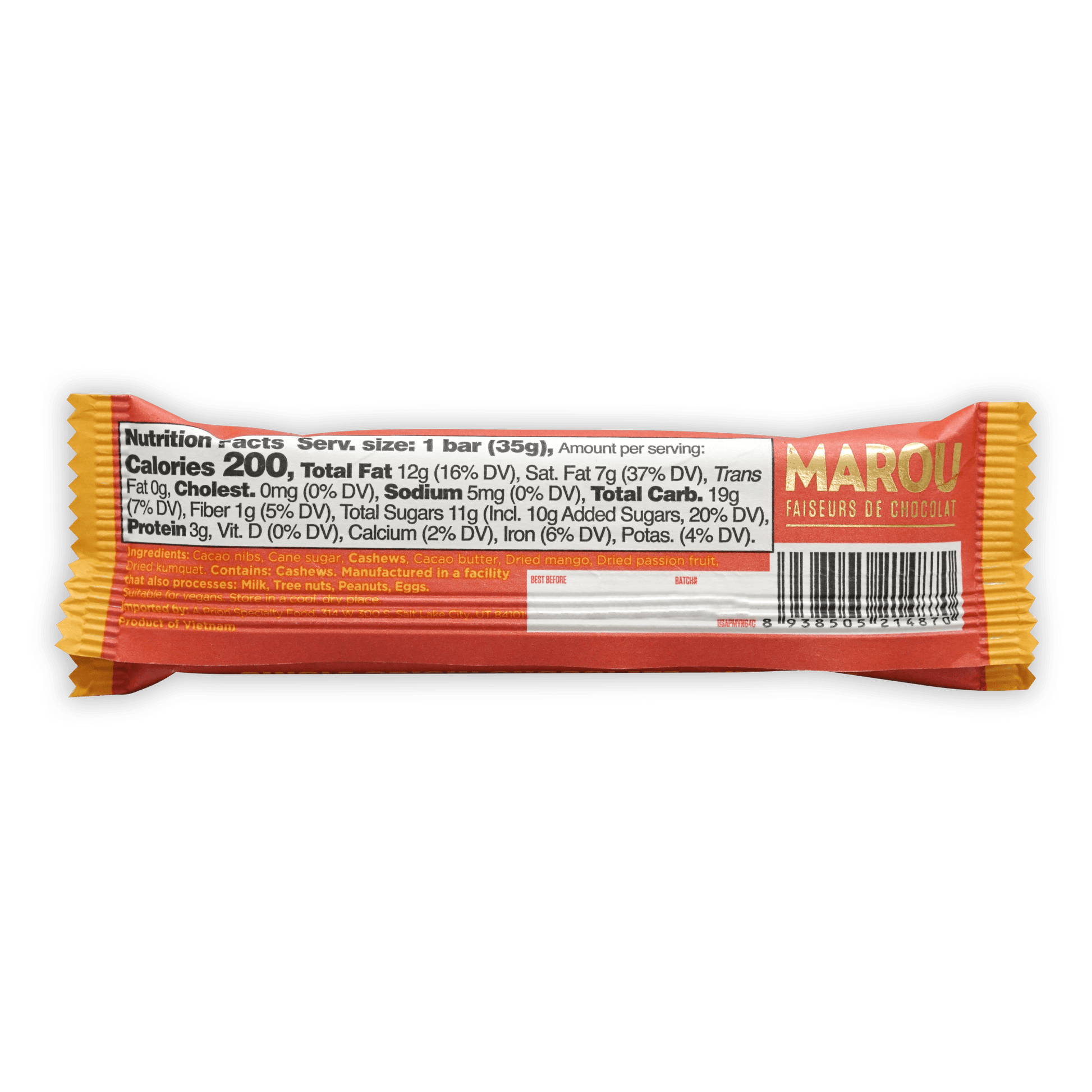 Ingredients: Tropical fruits and roasted cashews 64%: cacao nibs, cane sugar, cashews, cacao butter, dried mango, dried passion fruit, dried kumquat