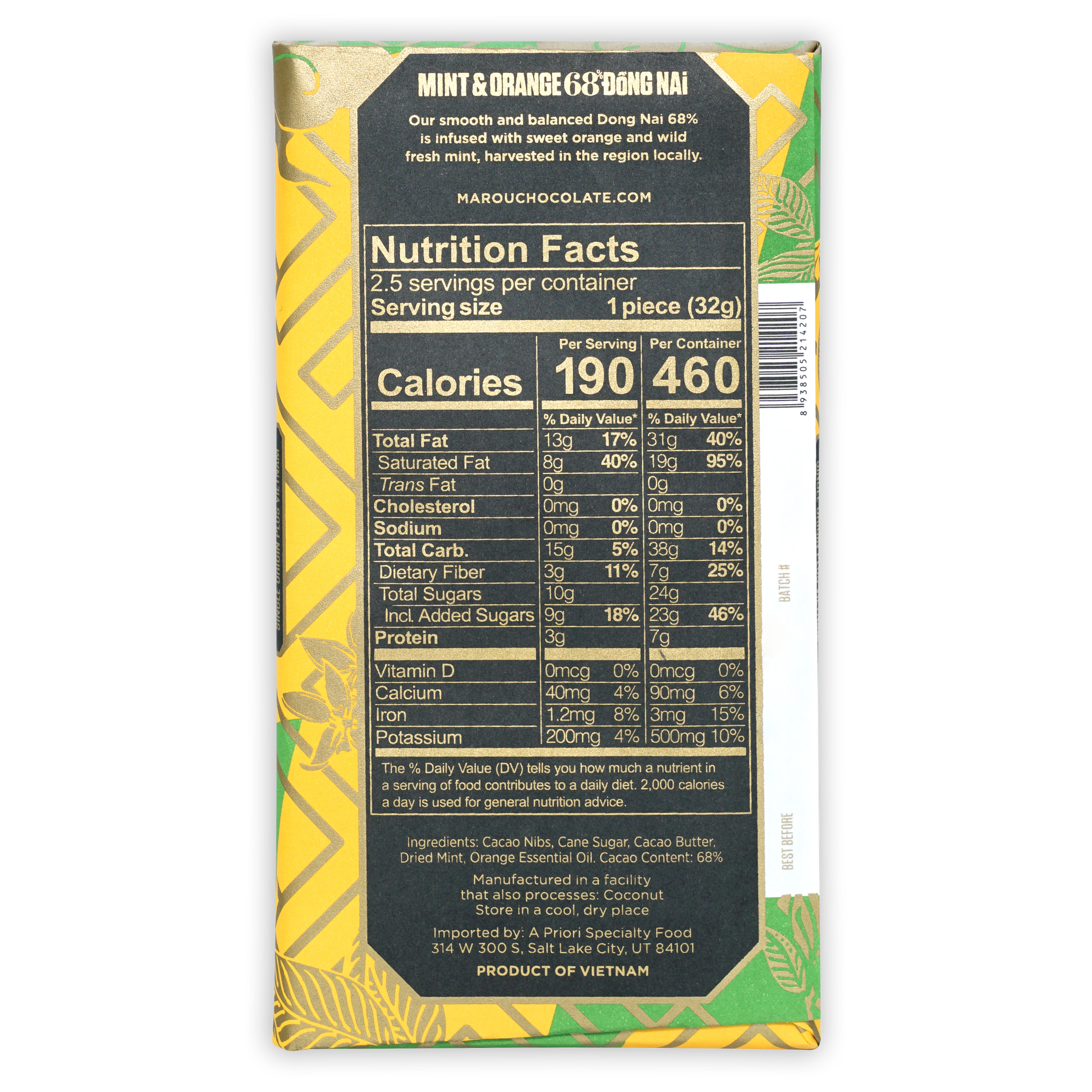 Marou's smooth and balanced Dong Nai 68% dark chocolate is infused with sweet orange and wild fresh mint, harvested locally within the region.