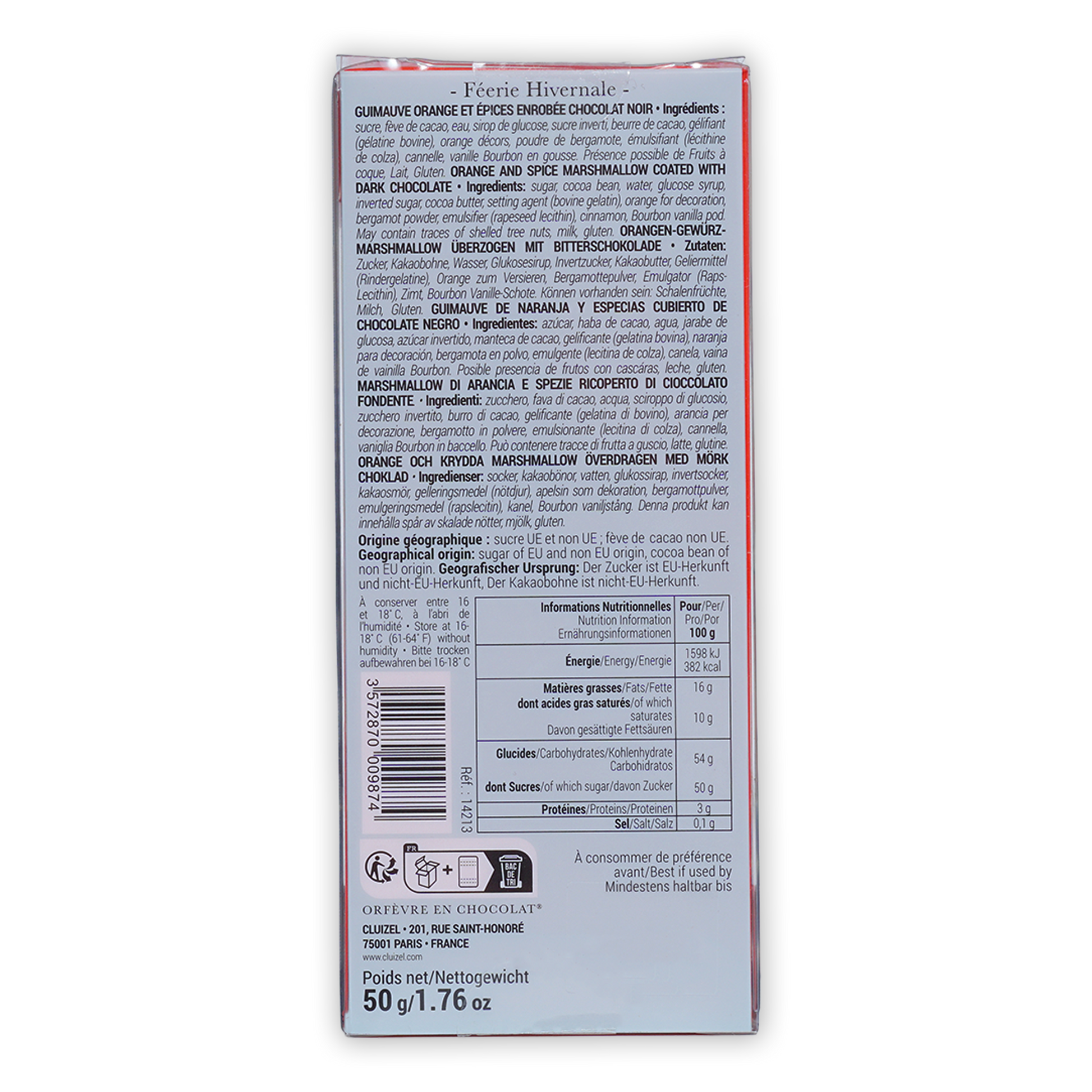 Ingredients: sugar, water, cocoa beans, glucose syrup, cocoa butter, invert sugar, whole milk powder, bovine gelatine, emulsifier (rapeseed lecithin), Bourbon vanilla pods.