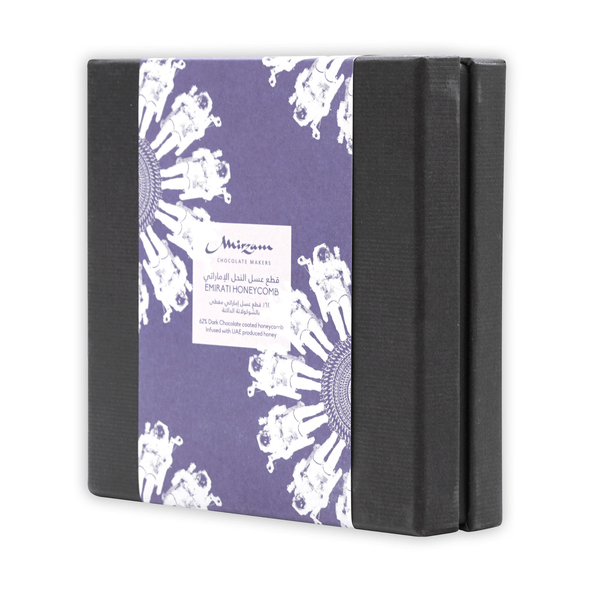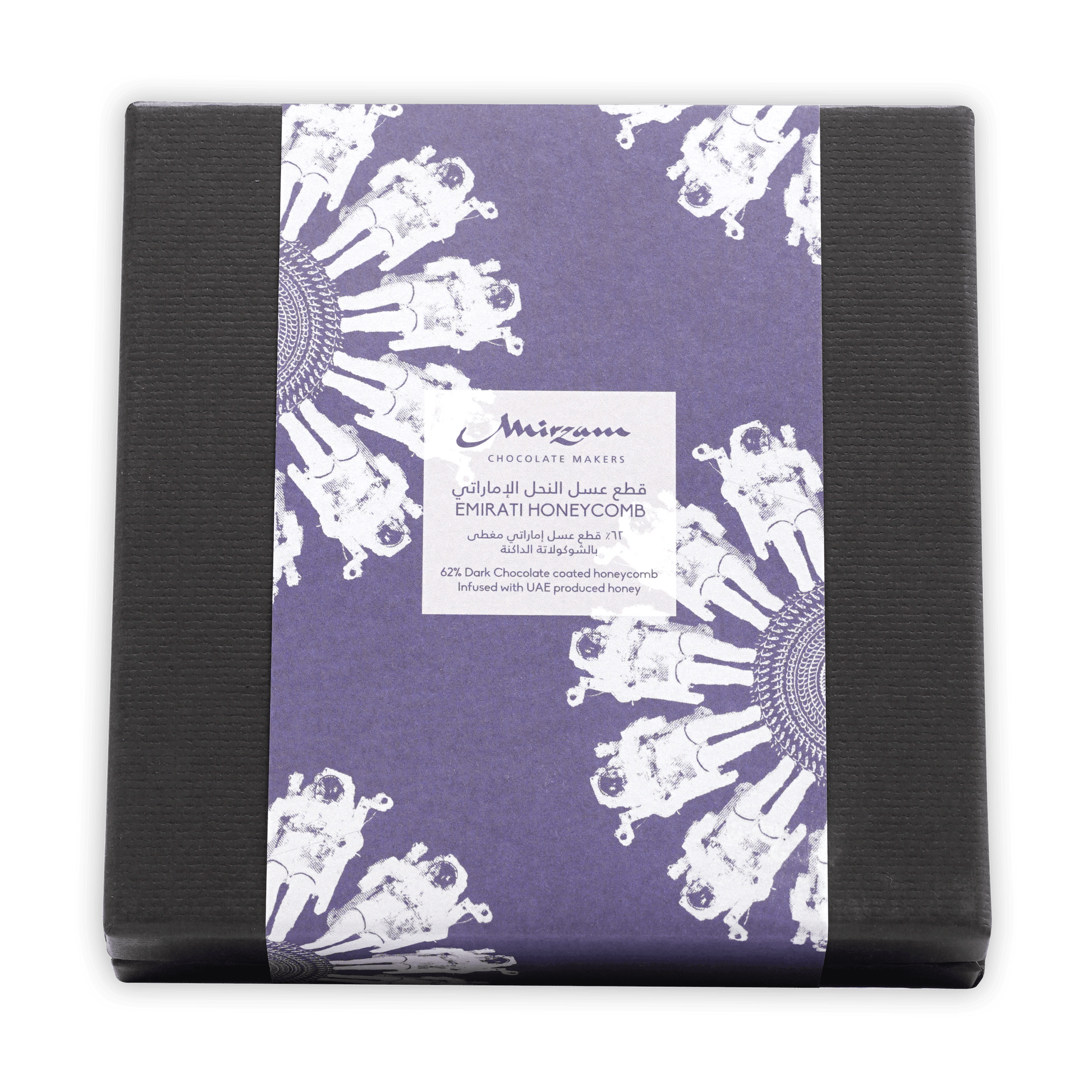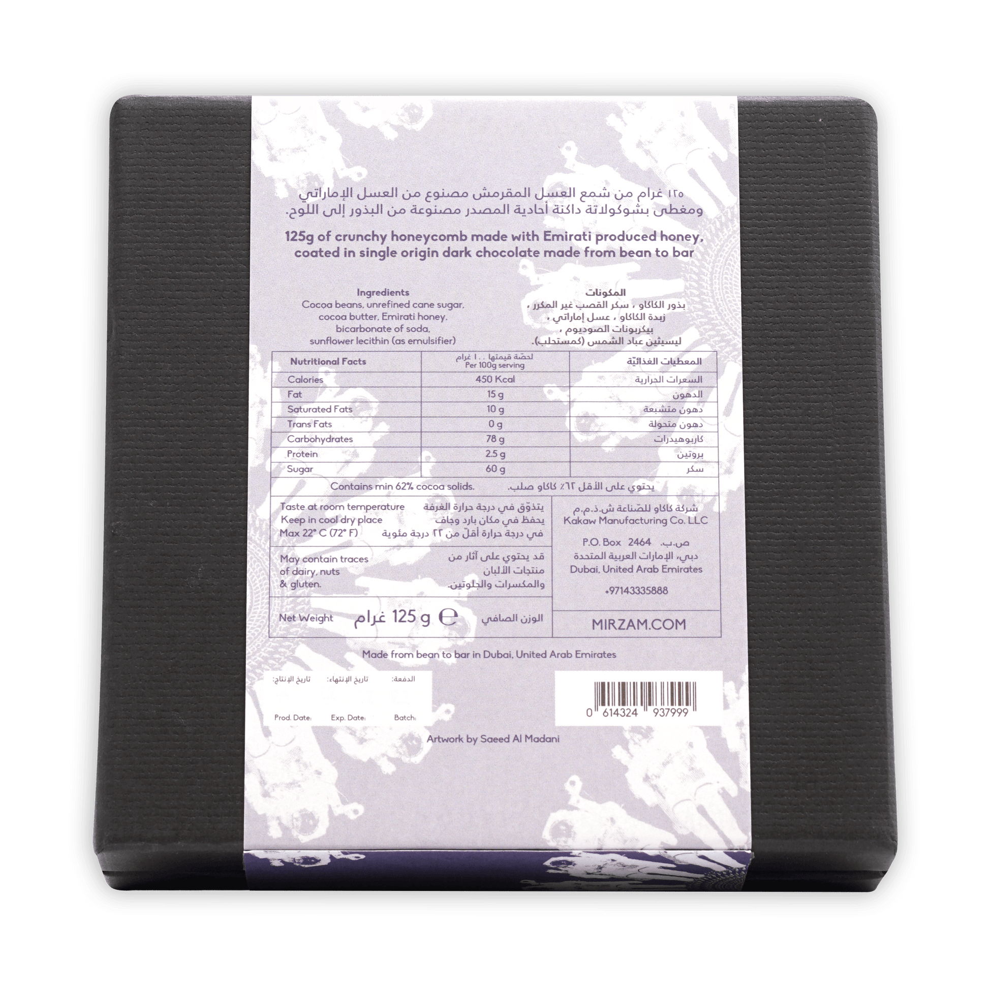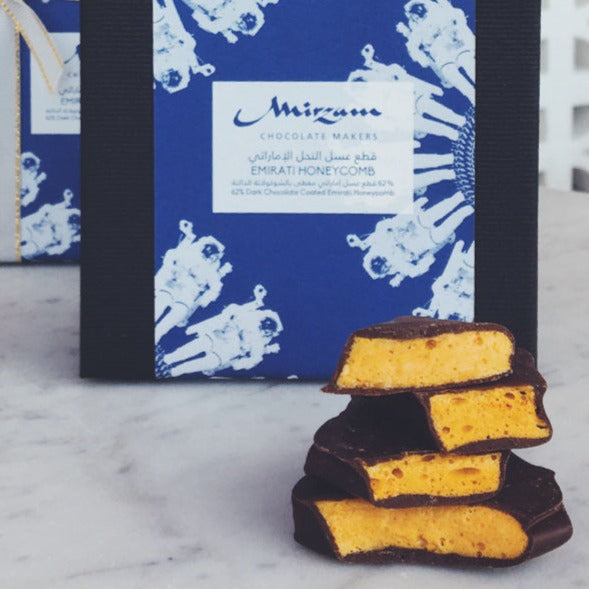 Honeycomb is made with freshly produced Emirati Honey, cracked into delicious chunks, and coated with their bean-to-bar produced single origin 62% Dark Chocolate.