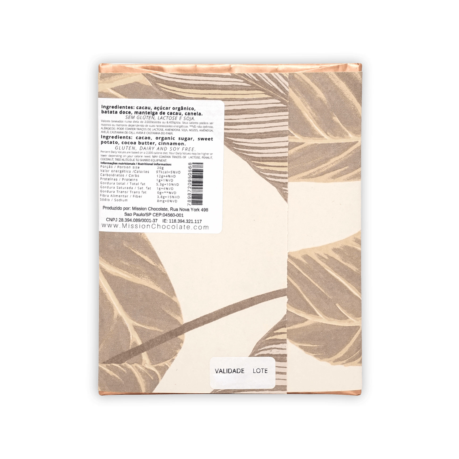 Ingredients: cacao beans, organic sugar, sweet potato, cocoa butter, cinnamon.