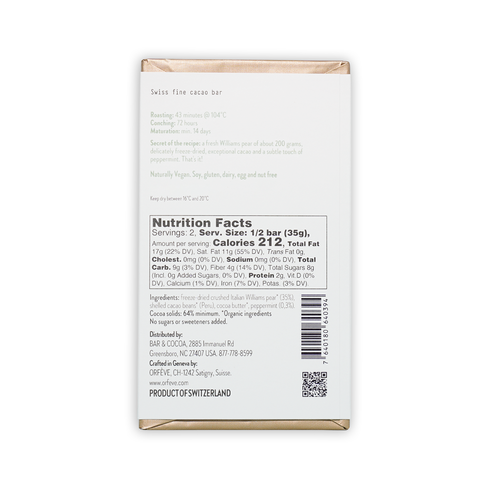 Ingredients: Crushed Italian Williams pear (35%), cacao beans (Peru), Cocoa butter, Peppermint (0.3%), (Cocoa solids: min. 64%). No Sugars or sweeteners added.