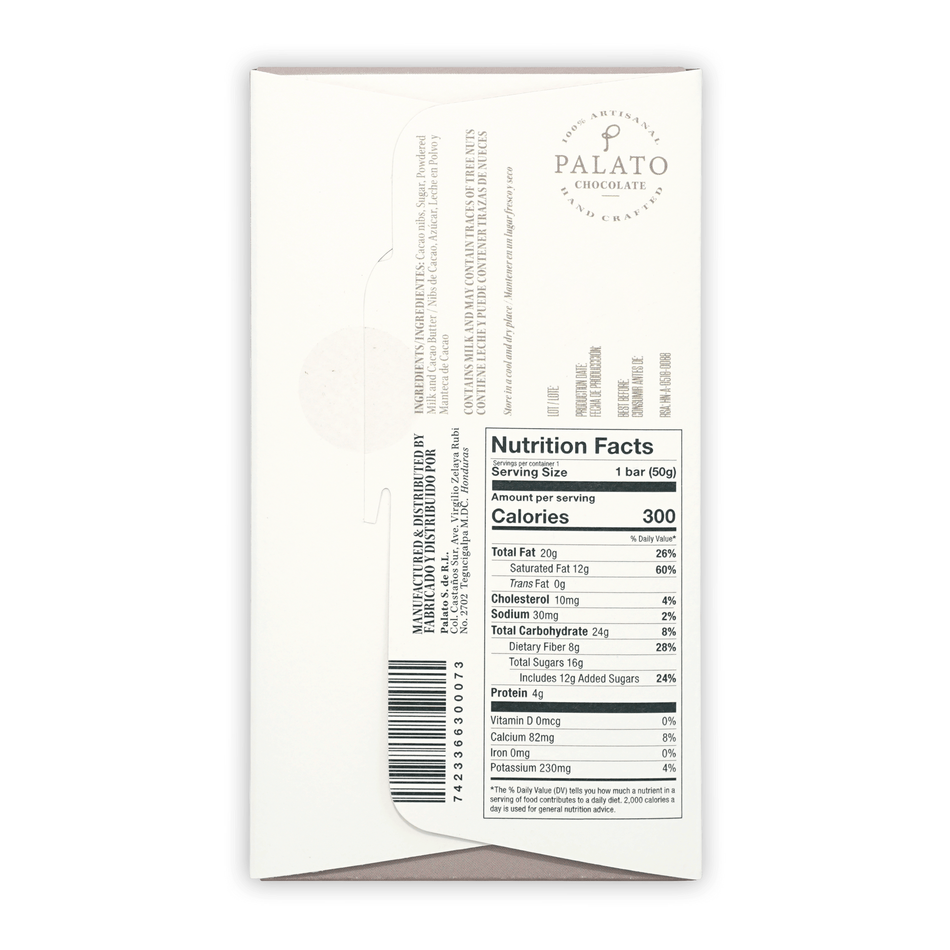 Palato ChocolatePalato Chocolate is a Honduran company specializing in the production of chocolate, founded in 2007 by Mónica Pedemonte (Chef Moni) who, after studying in United States, made a specialization in the prestigious Mausi Culinary Art Institute Sebess, from Buenos Aires, Argentina. Palato's cacao comes from remote places throughout the Honduran territory, such as zona occidental on the Atlantic coast, Olancho and La Mosquitia. Their production provides work for thousands of families, and supports the local economy.