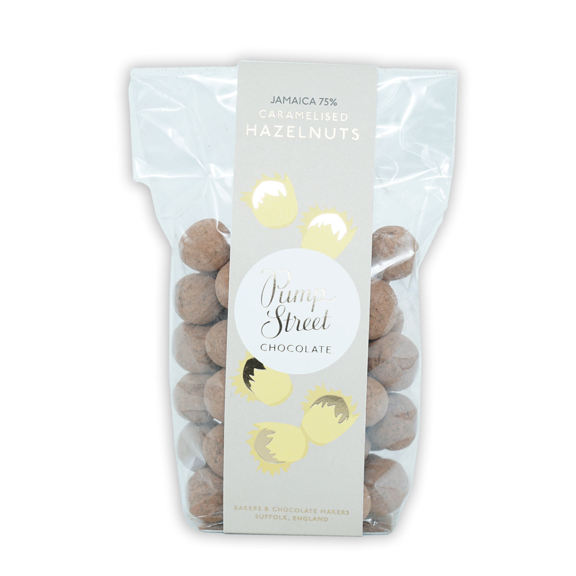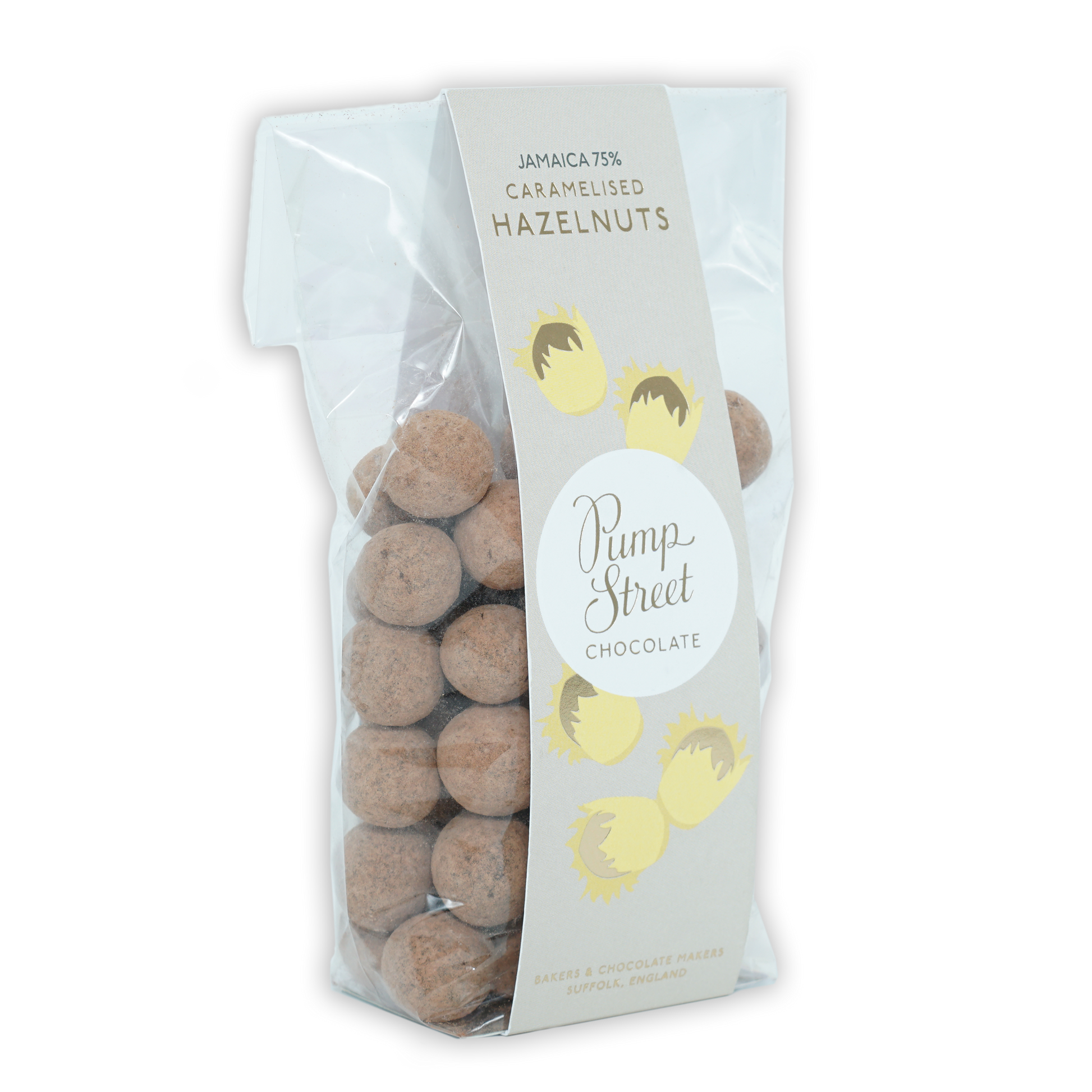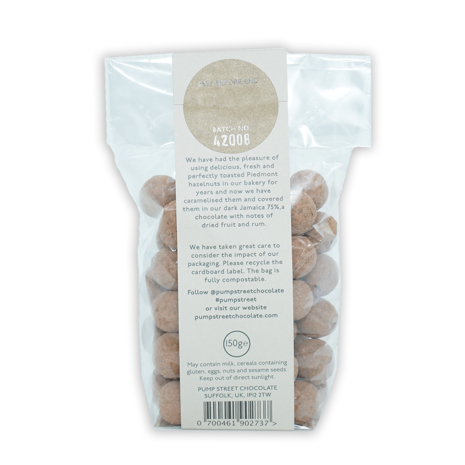 These caramelized hazelnuts offer a uniquely moreish and nutty treat, made from hazelnuts selected from Piedmont, Italy. Each is coated in sweet caramel and enrobed in Pump Street's single-origin Jamaican chocolate. Suitable for a sophisticated gift or shareable treat. Lovingly hand-wrapped in a compostable bag and recyclable sleeve.