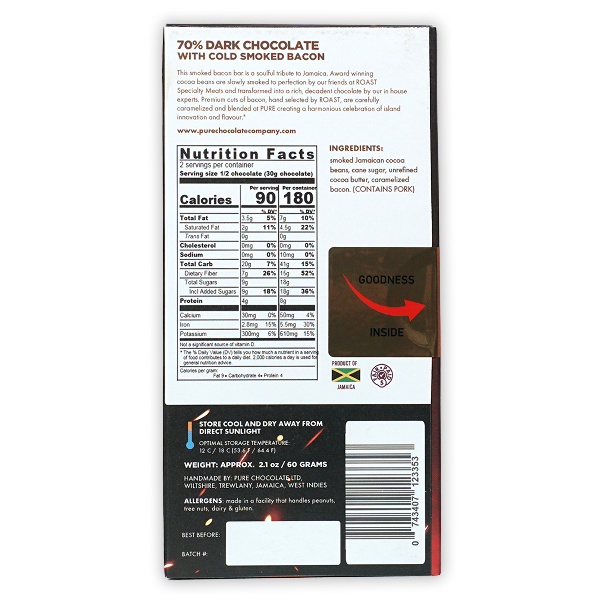 ```Ingredients: smoked Jamaican cocoa beans, cane sugar, unrefined cocoa butter, caramelized bacon. (contains pork)