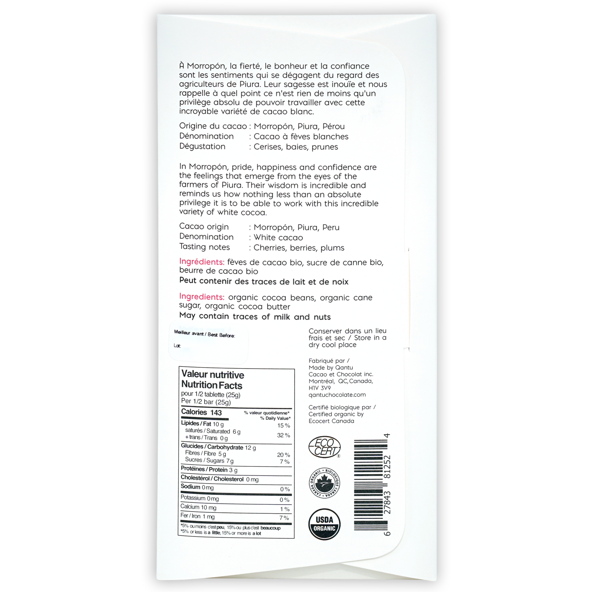 With a proportion of a third of white cocoa beans, this black chocolate, round in the mouth, offers complex notes of cherries, plums and small red fruits.