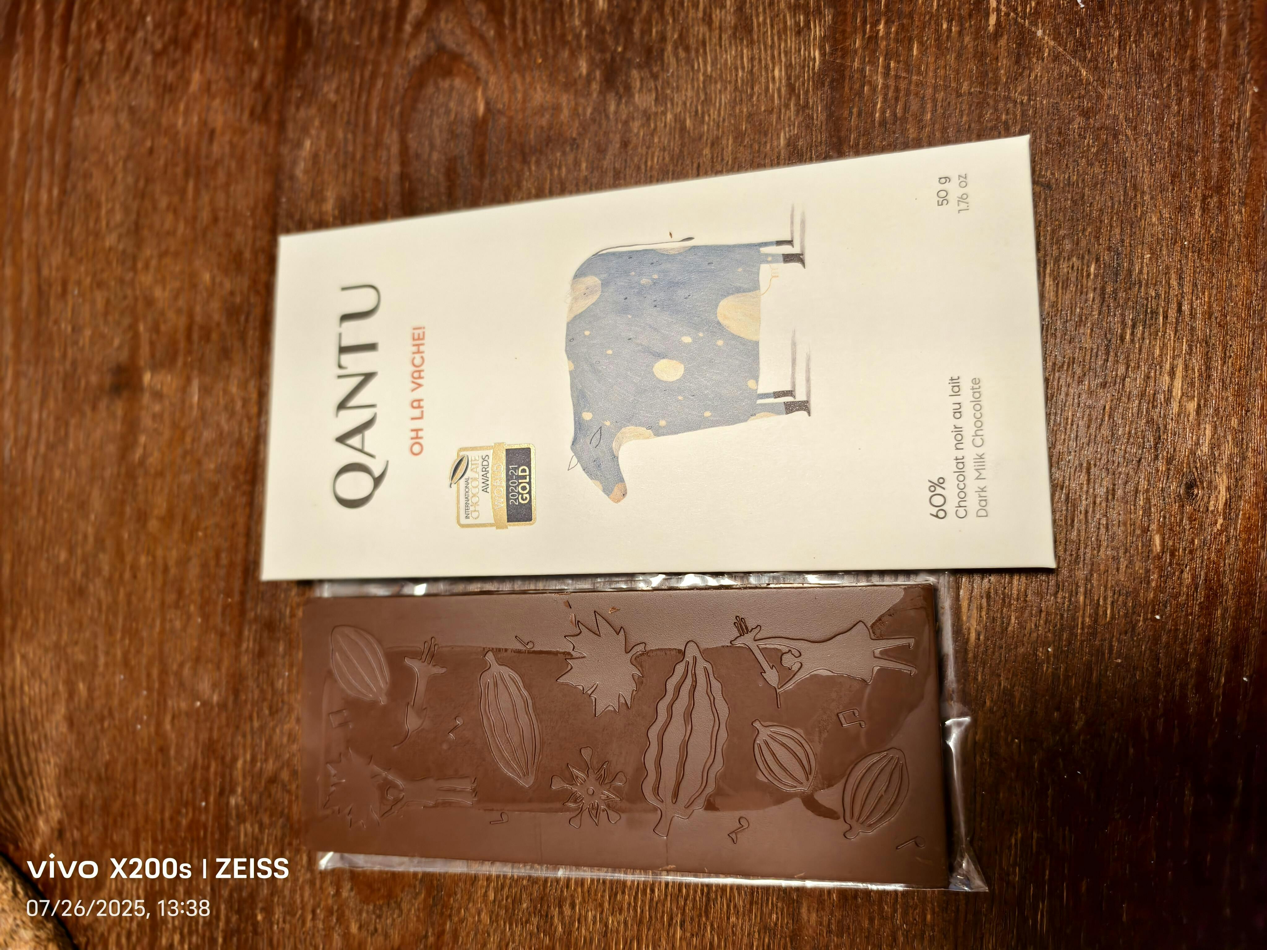 The Qantu Oh La Vache! 60% Dark Milk chocolate is a very nice milk chocolate. It has no additives other than whole milk powder, so there is lots of chocolate flavor. It melts quickly at the end, with a stronger chocolate taste lingering. Very nice!