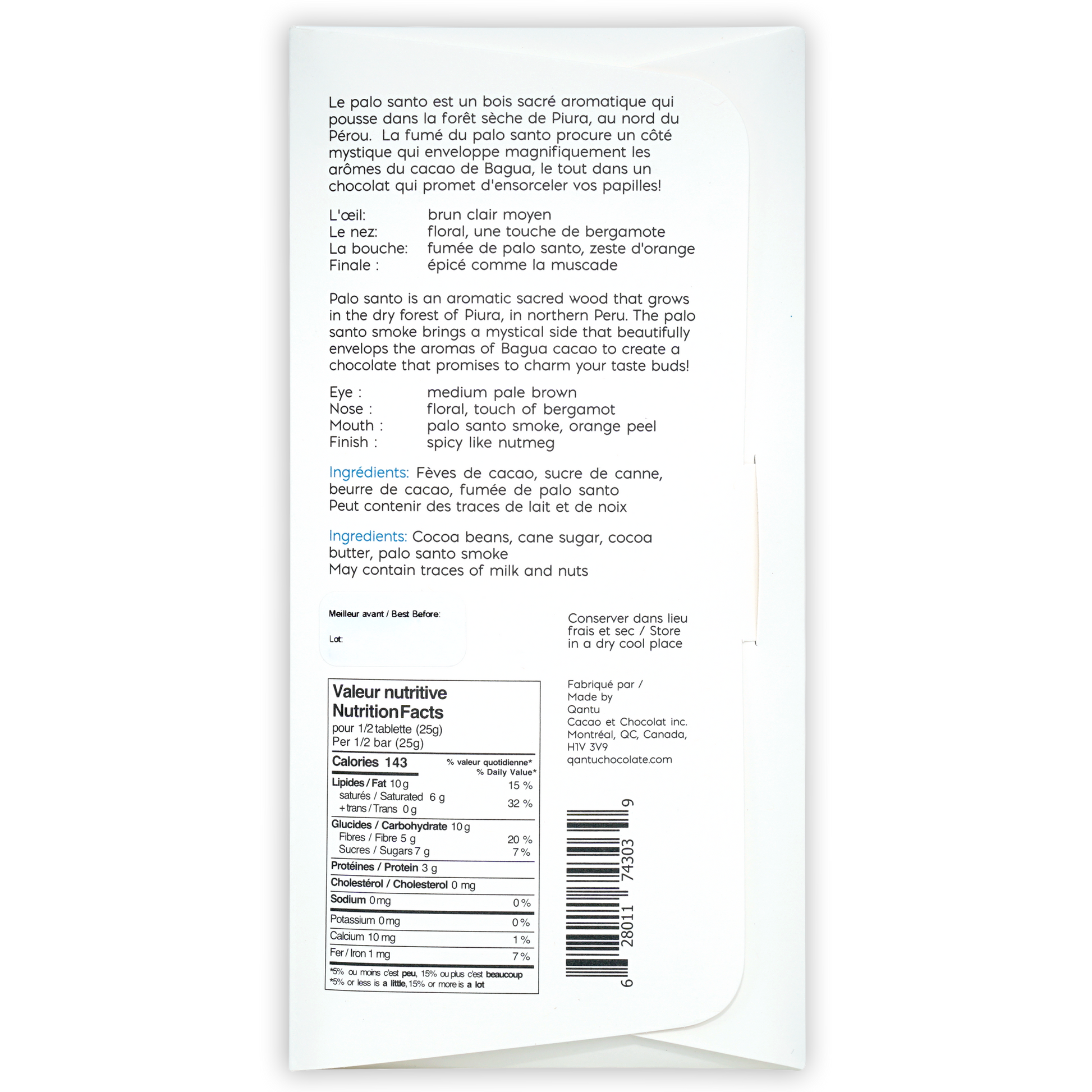 Ingredients: cocoa beans, cane sugar, cocoa butter, Palo Santo sacred smoke.