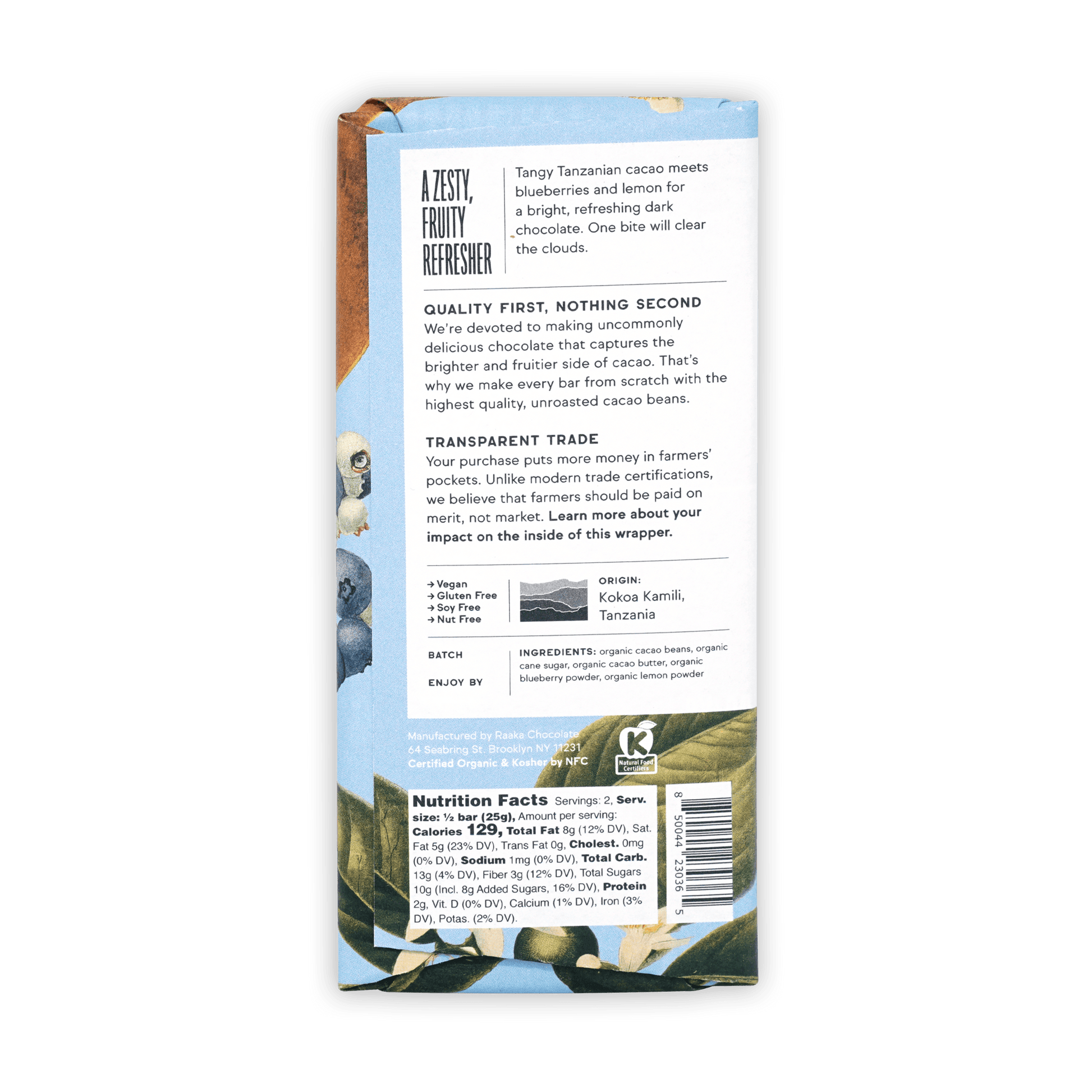 Ingredients: organic cacao beans, organic cane sugar, organic cacao butter, organic blueberry powder, organic lemon powder