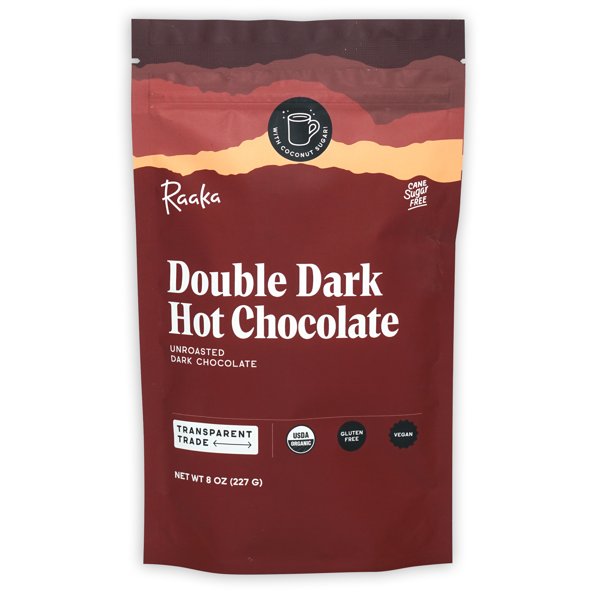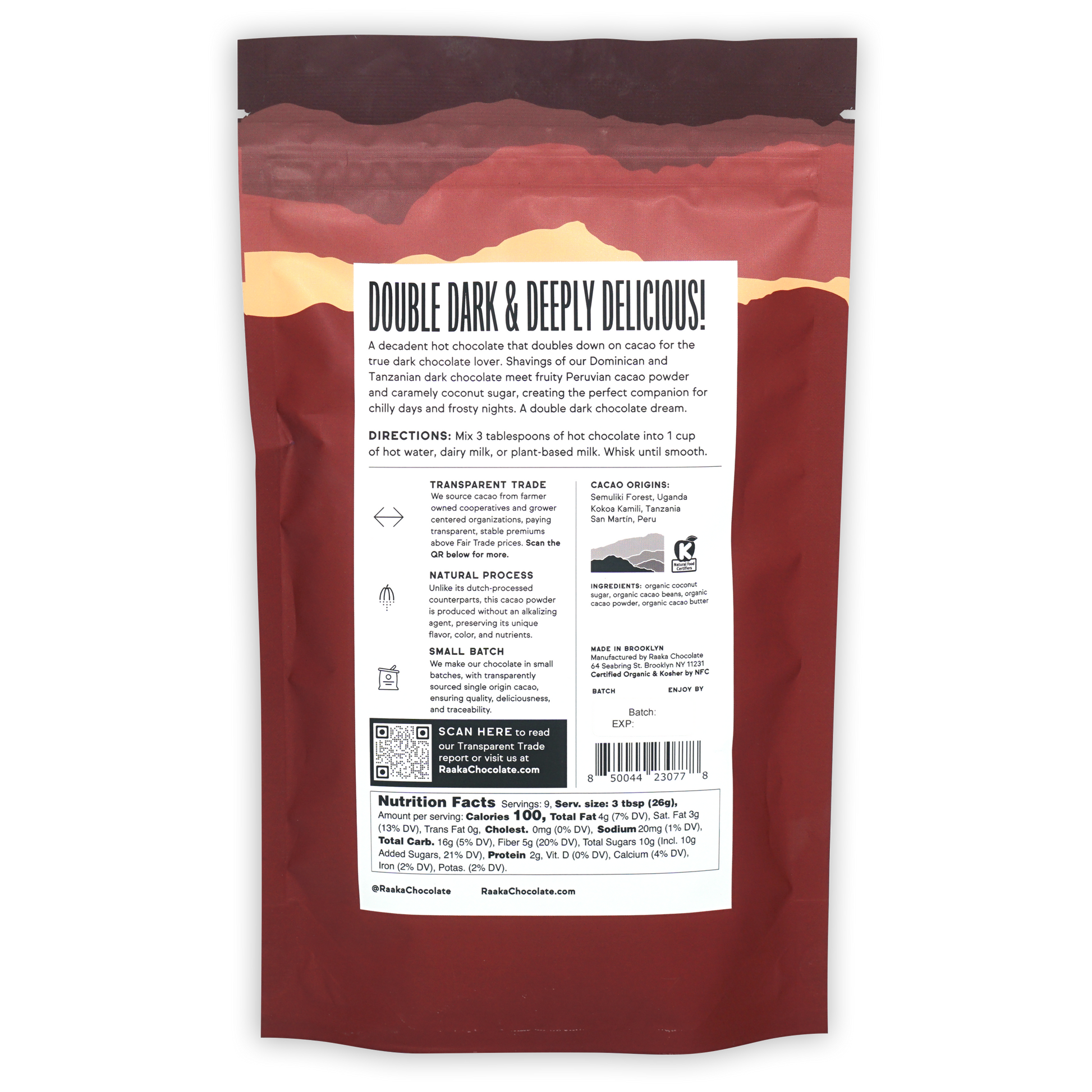 A decadent hot chocolate that doubles down on cacao for the true dark chocolate lover. Shavings of Raaka's Dominican and Tanzanian dark chocolate meet the fruity Peruvian cacao powder and caramelly coconut sugar, creating the perfect companion for chilly days and frosty nights. A double dark chocolate dream.