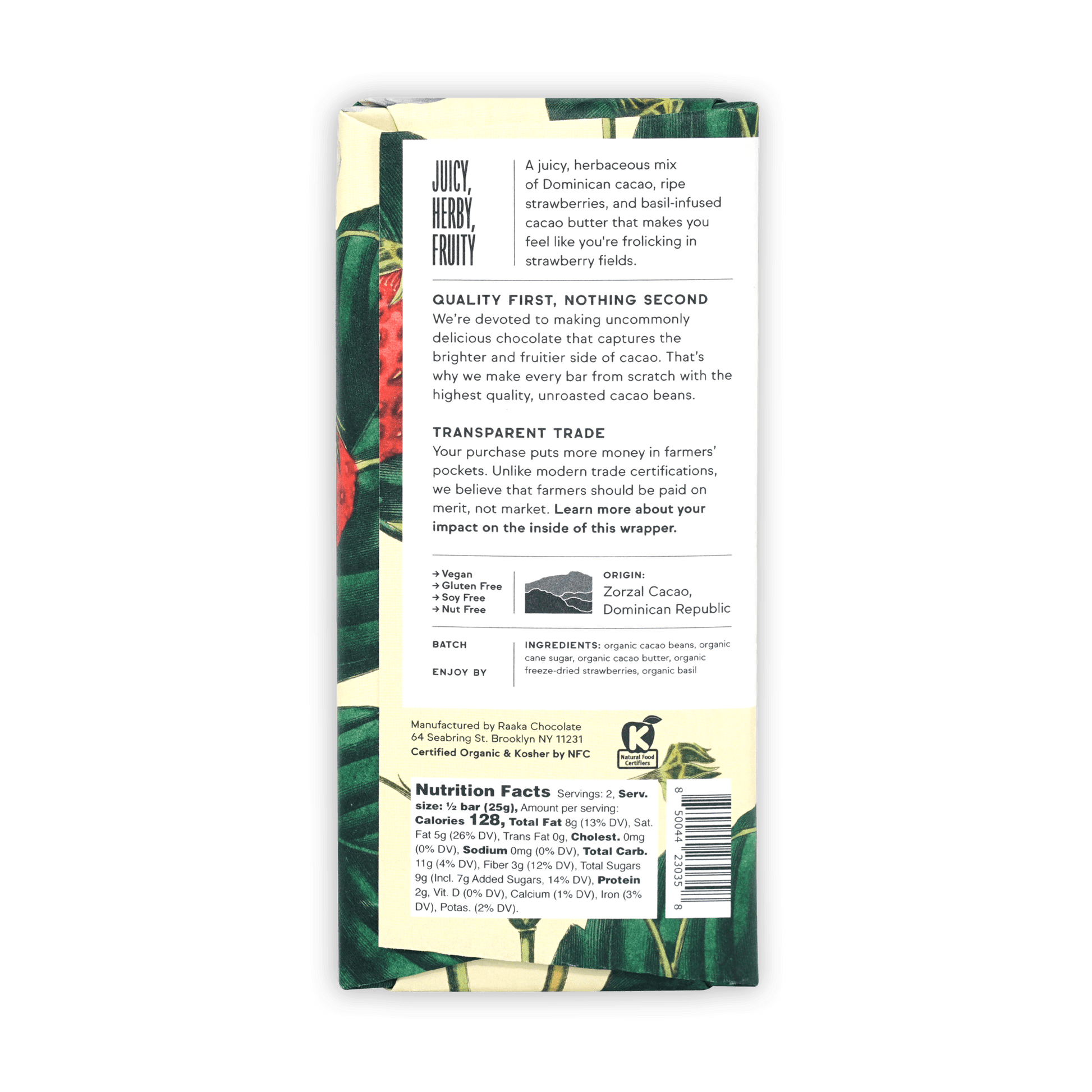 Ingredients: organic cacao beans, organic cane sugar, organic cacao butter, organic freeze-dried strawberries, organic basil