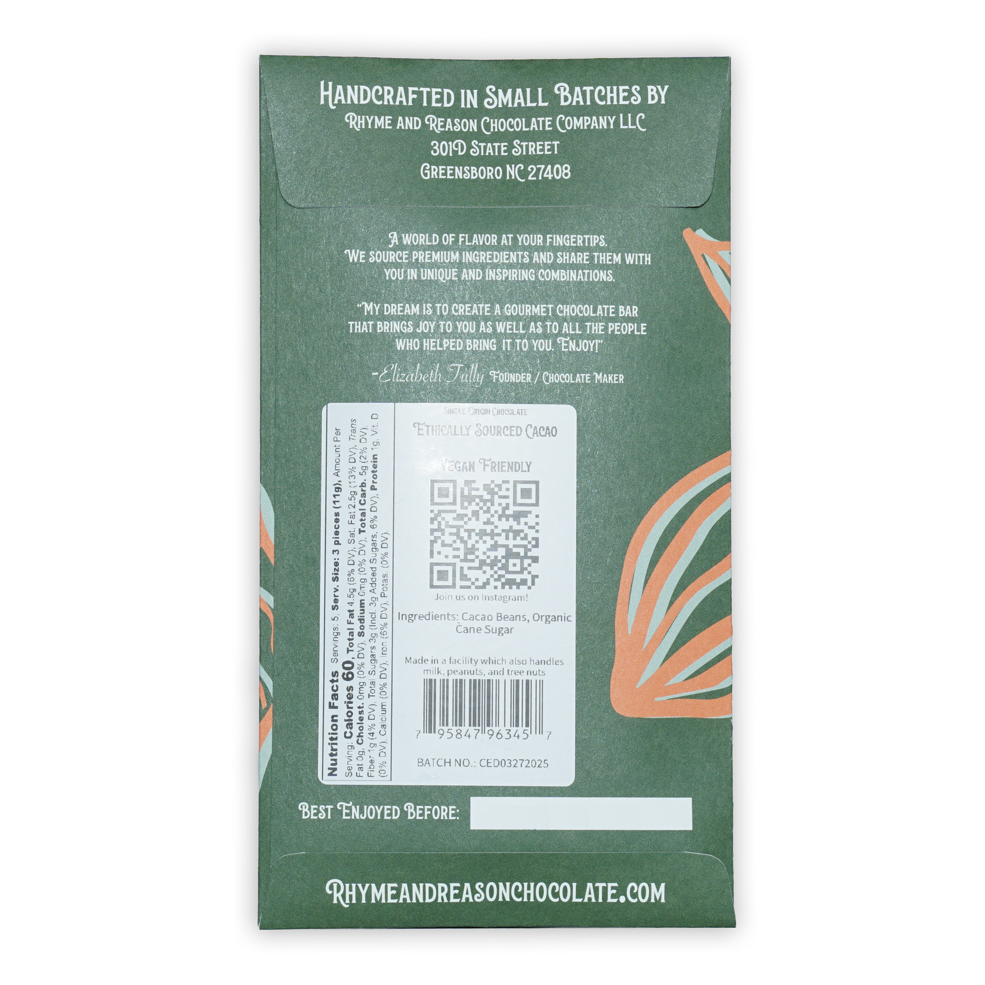 Maker Rhyme and ReasonMeet Elizabeth Tully, founder of Rhyme and Reason Chocolate company. We're thrilled to feature this local and award winning chocolate maker from North Carolina, just miles away from our headquaters. Elizabeth got her start in making chocolate while she and her husband lived in Singapore and have alreay won a few accolodes for their unique flavors and chocolate.  Cacao Region Esmeraldas, EcuadorEsmeraldas is the northernmost province of Ecuador, bordering both the Pacific Ocean and western Colombia. The province is notable for its strong Afro-Ecuadorian culture & seafood-based cuisine, as well as the beautiful beaches. Much of Esmeraldas’ population relies upon agriculture to make a living, with the most important crops being banana, tobacco, coffee, and cacao. Cacao Estate Costa EsmeraldasLocated in the coastal Ecuadorian province of Esmeraldas, this family-run estate has experienced a complete turnaround in recent years. After nearly a decade of their farm just scraping by through selling produce into the commodity market, in 2015 the Salazar family took on the project of completely revamping the 100-hectare farm. This included adding a complete post-harvest processing facility on-site, which is now managed by Freddy Salazar, the youngest sibling in the family. Management of the cacao orchards create over 40 full-time jobs within the local community in rural Esmeraldas, while the fine flavor neo-nacional beans they grow are now used by over a dozen chocolate companies around the world. Makers favor it for its strong base notes of cocoa, roasted nuts, and light fruitiness, with almost no astringency or bitterness. Cacao Strain Cacao Strain: EsmeraldasThis cacao strain takes its name from the northern Ecuadorean province to which it is native. The path which brought it there is yet unclear, but experts agree that Esmeraldas contains some amount of criollo ancestry, maybe even the same criollo types found in ancient Mesoamerica. But whatever its origin, the pods are mostly small and maroon-colored, with relatively few fruits per tree. The characteristic flavor profile of Esmeraldas cacao is incredibly mild, with traces of spices and melon, though chocolate made from pure Esmeraldas is uncommon.