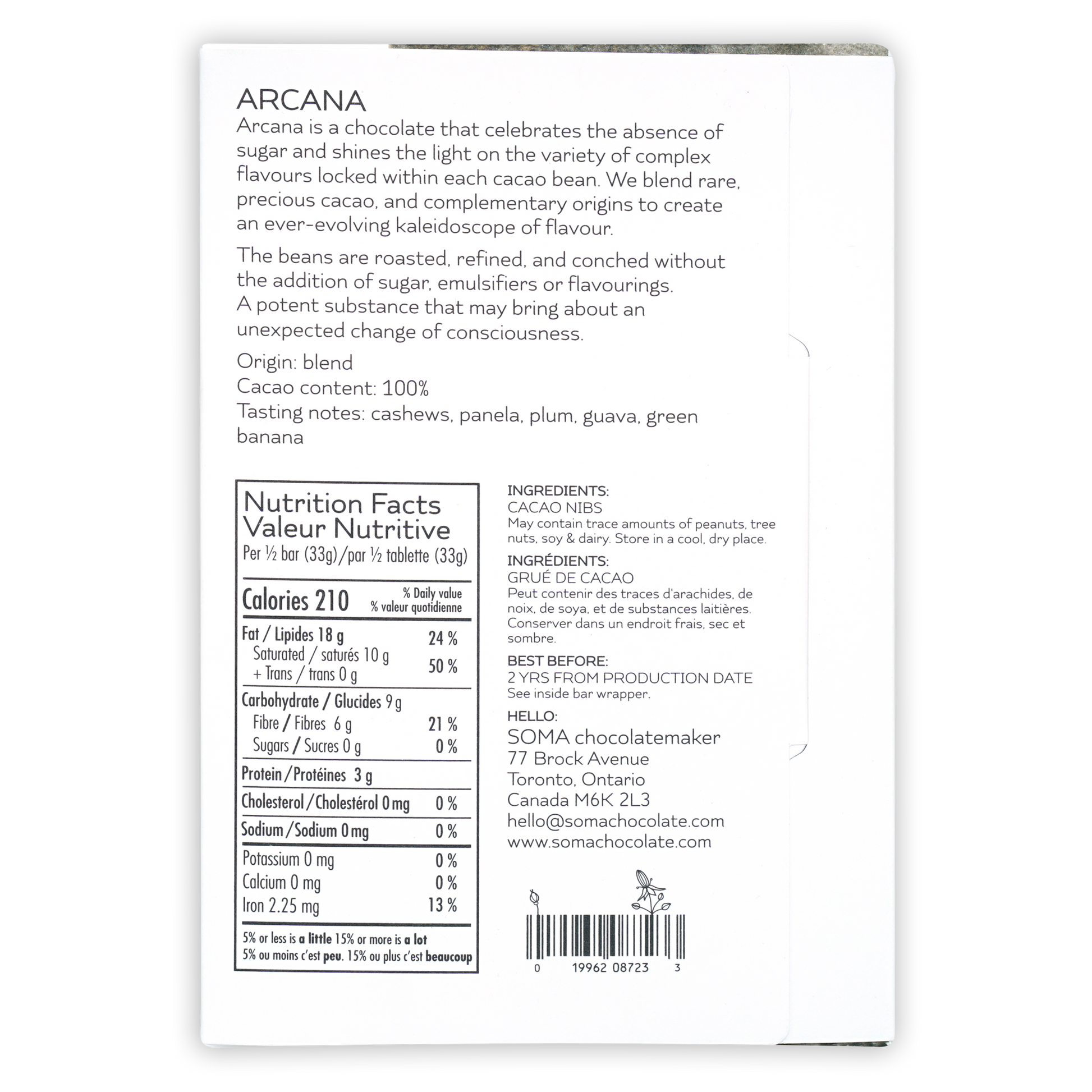 Arcana is a chocolate that celebrates the absence of sugar and shines the light on the variety of complex flavors locked within each cacao bean. The base is the rare and precious Venezuelan Porcelana, blended with seasonal and complimentary origins to create an ever-evolving kaleidoscope of flavor.