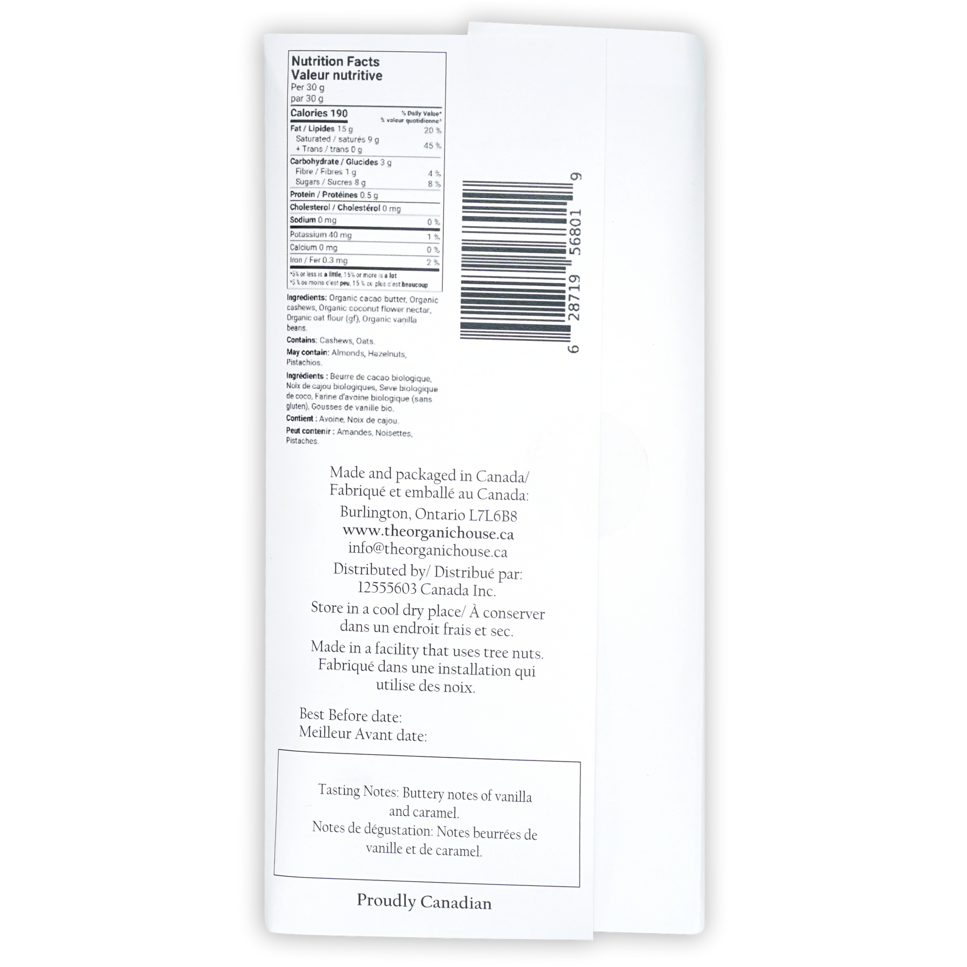 Ingredients: organic cacao butter, organic coconut flower nectar, organic cashew milk, organic oat flour, organic vanilla beans.