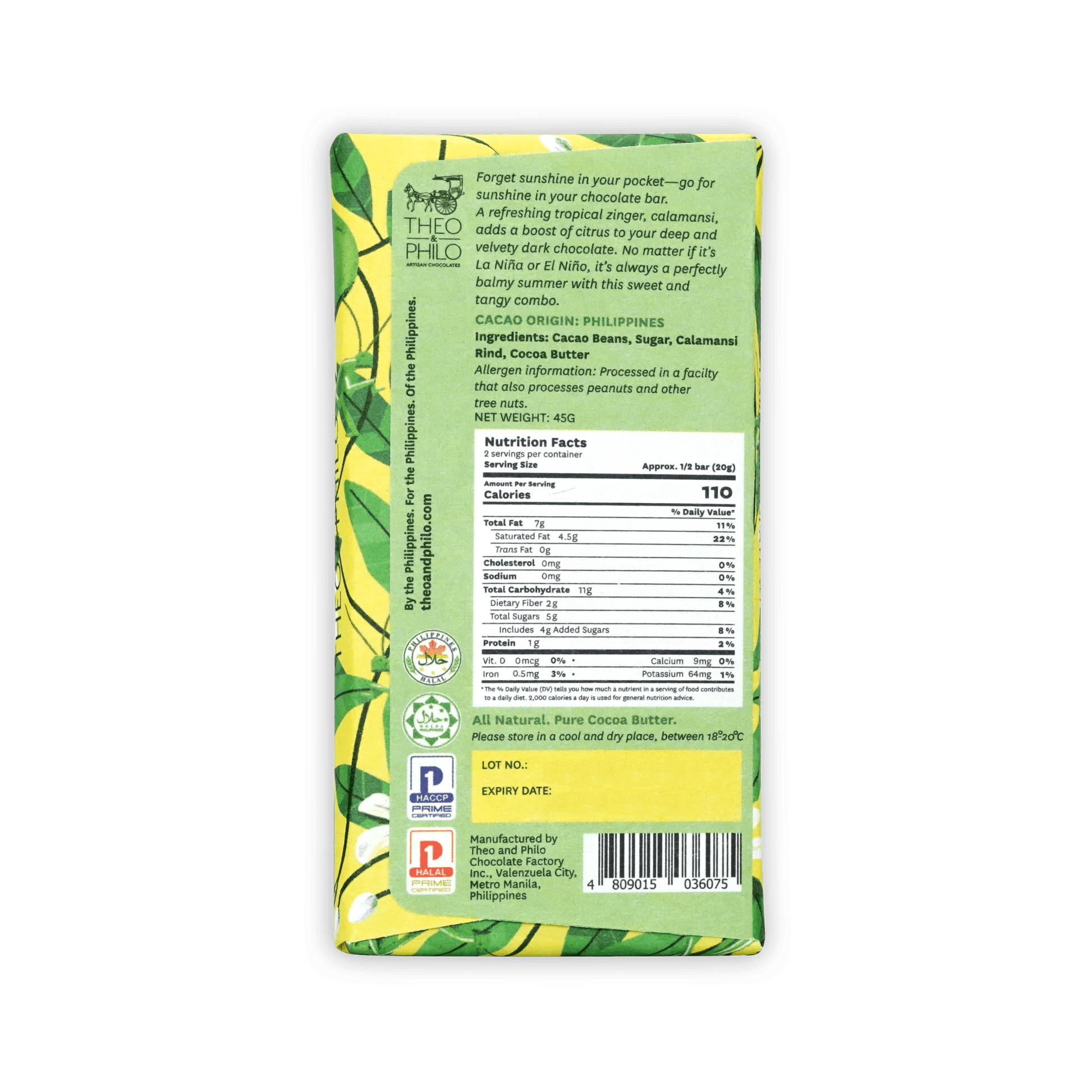 Forget sunshine in your pocket go for sunshine in your chocolate bar. A refreshing tropical zinger, calamansi, adds a boost of citrus to your deep and velvety dark chocolate. No matter if it's La Niña or El Niño, it's always a perfectly balmy summer with this sweet and tangy combo.