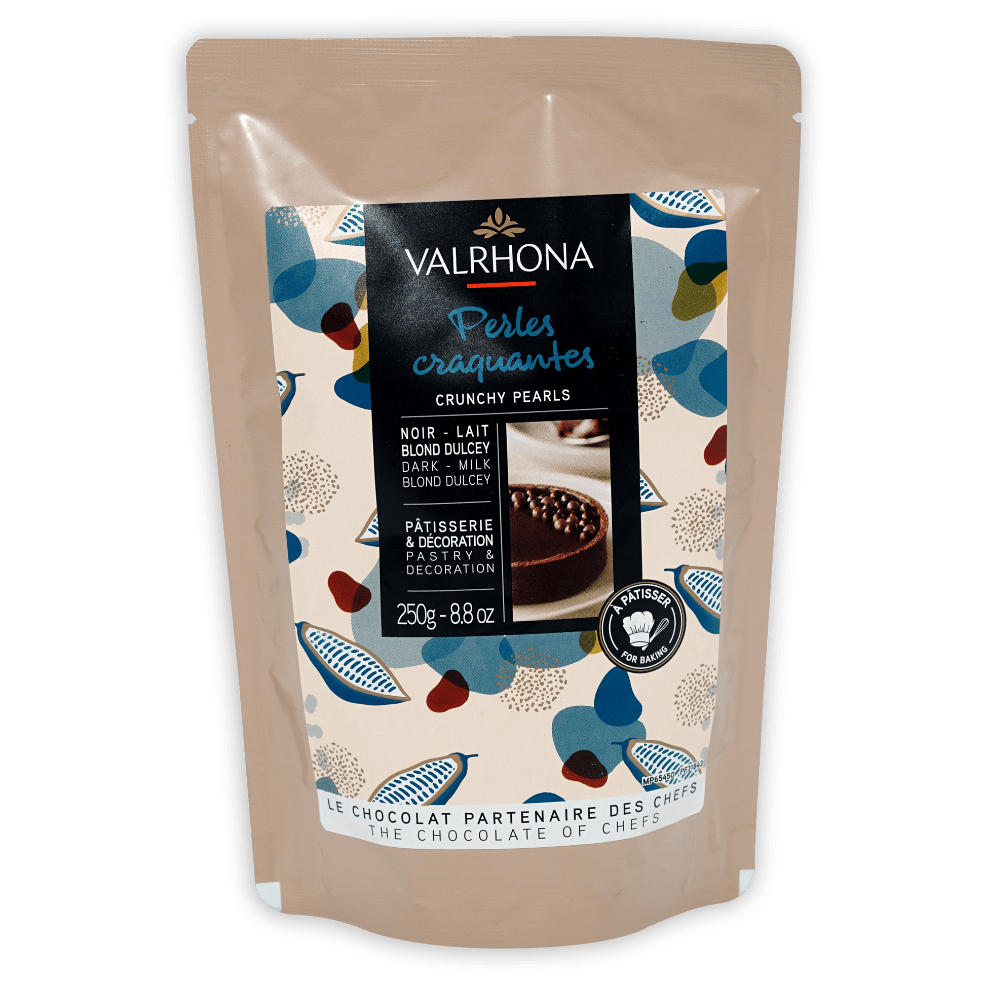 3 flavors and unique textures to wake up your senses. Baking Pearls - A Valrhona Twist on Chocolate Chips: This pack is composed of the delicious Dark Chocolate 55%, Milk Chocolate, and Dulcey® 32% Crunchy Pearls: Stable when cooked, they impart a strong chocolate taste and molten texture to your creations. They can also be used in all kinds of cold preparations and mixtures, both as a mix-in and as a decoration. Crunchy Pearls - For Snacking or for Topping, Valrhona Crunchy Pearls will thrill your senses!
