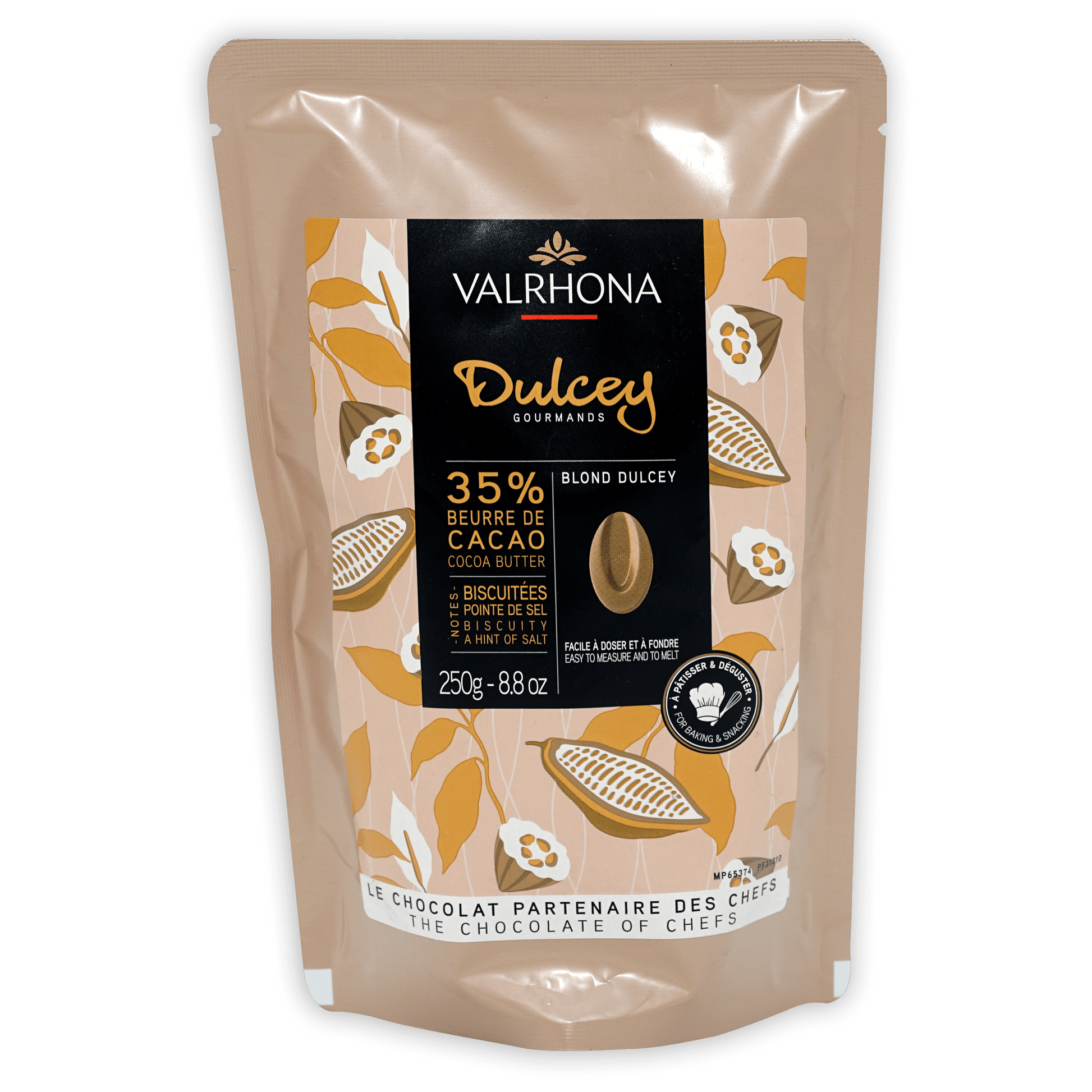 Dulcey® 35% is smooth, creamy chocolate with a velvety and enveloping texture and a warm, golden color. The first notes are buttery, toasty, and not too sweet, gradually giving way to the flavors of freshly-baked shortbread with a pinch of salt.