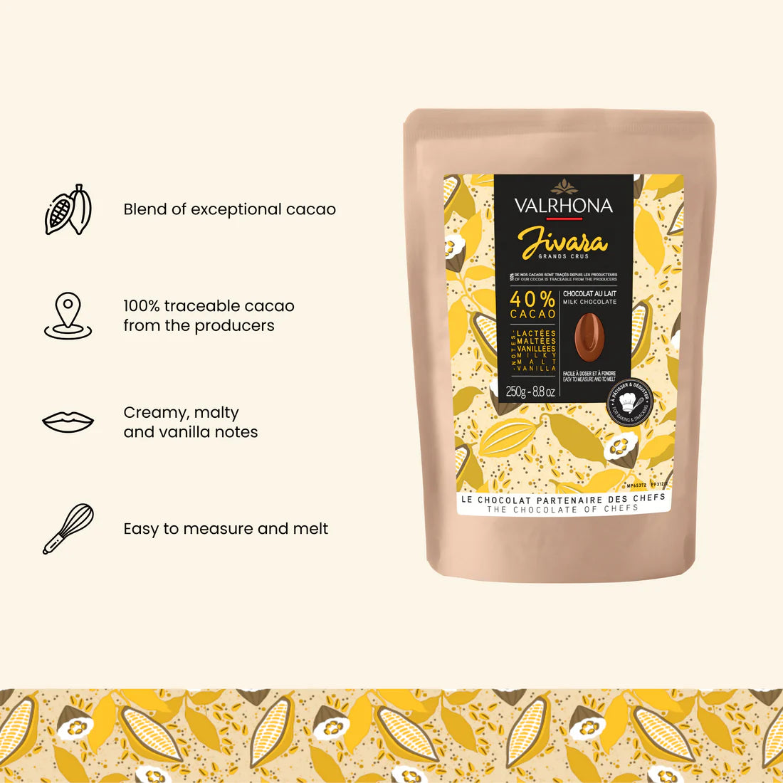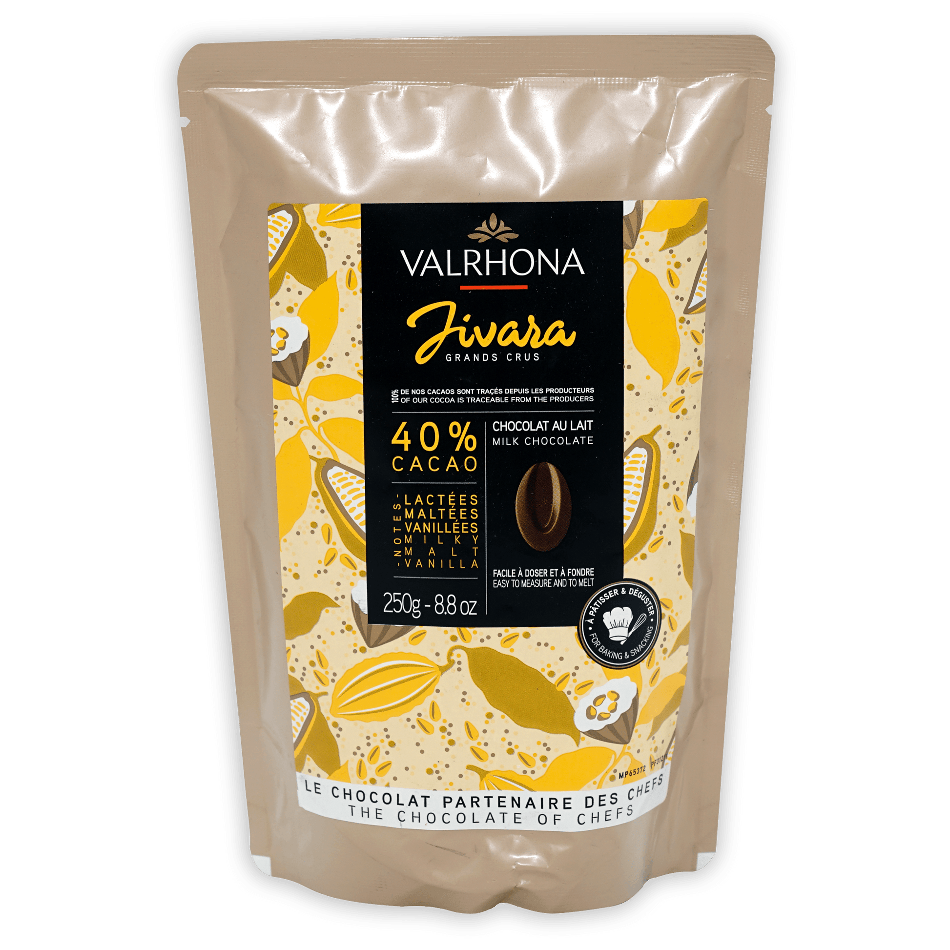 JIVARA 40% is an exceptional milk chocolate with pronounced cocoa notes, which harmonize perfectly with notes of vanilla and a malt finish.