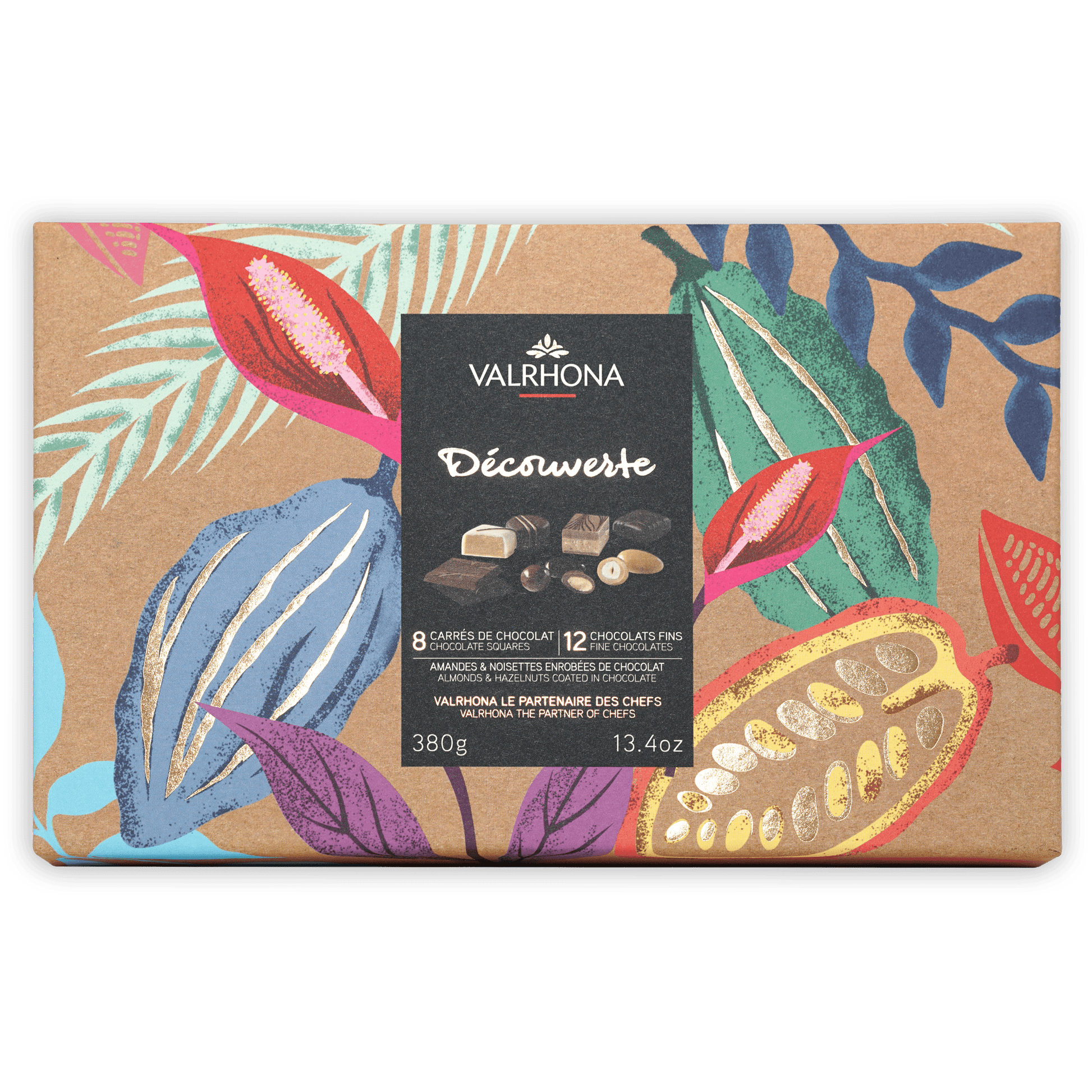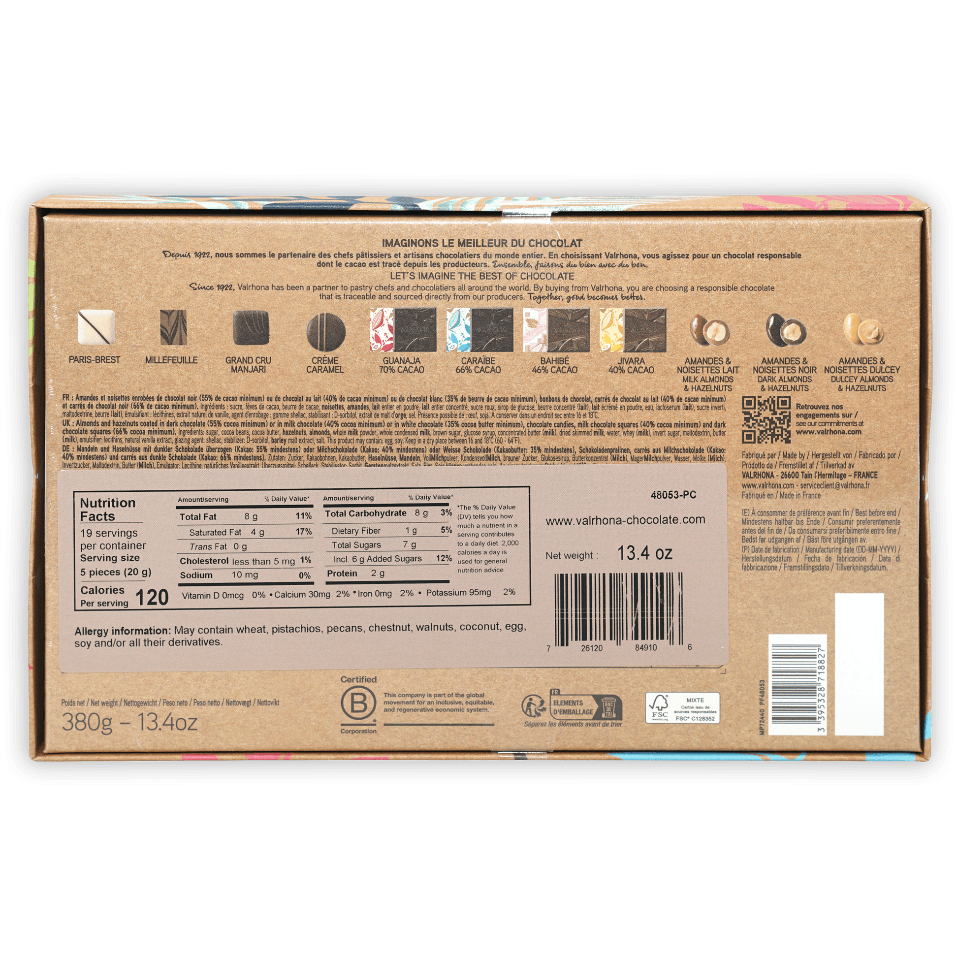 This Dark, Milk, and Dulcey gift box includes 8 Chocolate Squares Grand Cru, 12 assorted Fine Chocolates, and Almonds and hazelnuts coated in chocolate.
