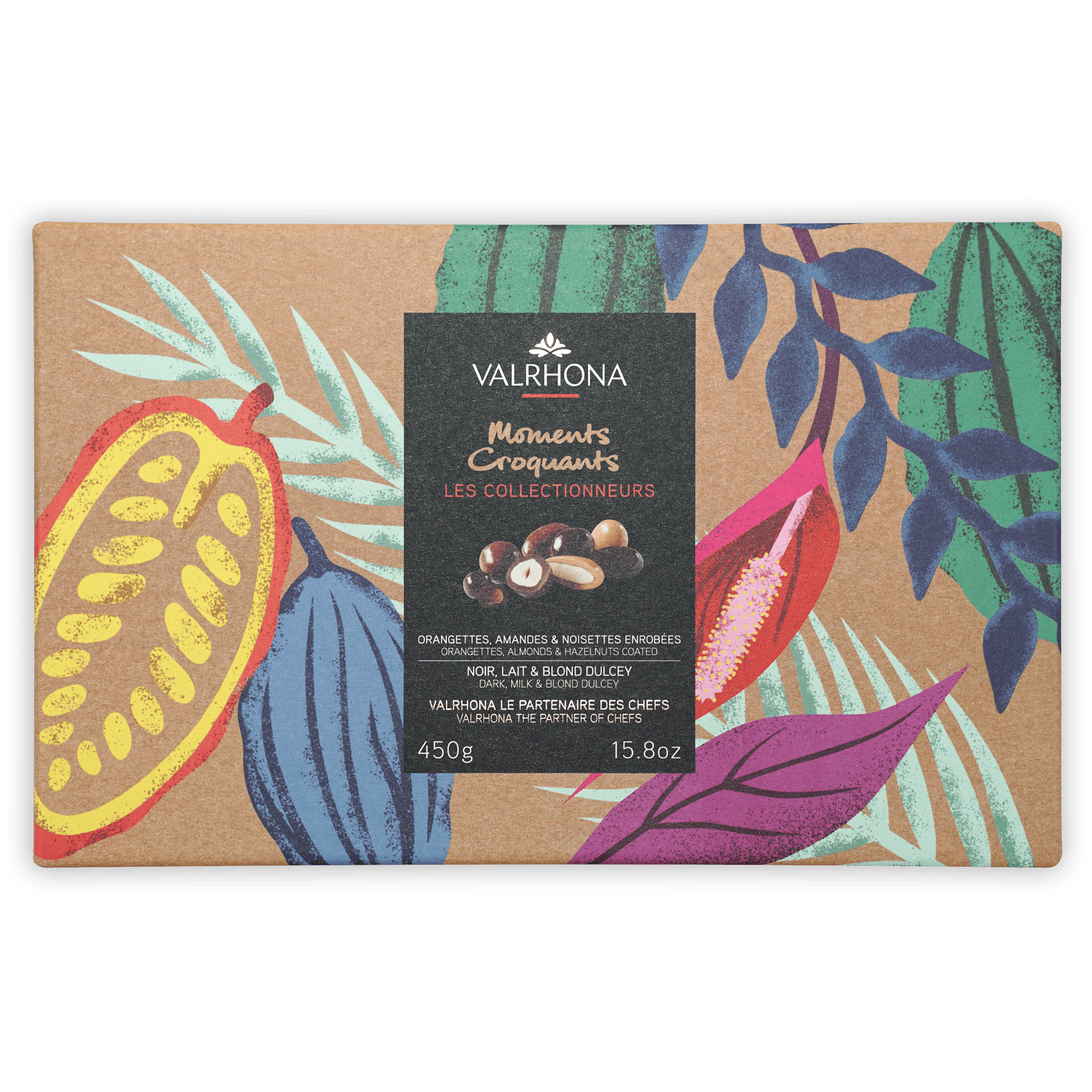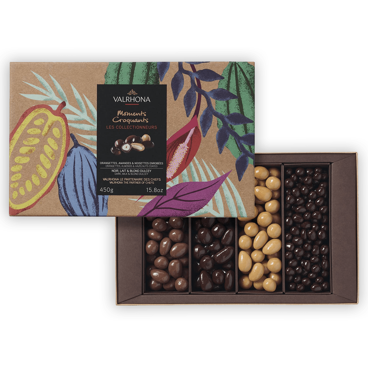 The Valrhona Collectors Box offers a gourmet selection of carefully chosen almonds and hazelnuts coated in dark chocolate, milk, Dulcey chocolate, and dark chocolate-covered Orange Peel. Ideal for a crunchy and indulgent snack and great for gifting.