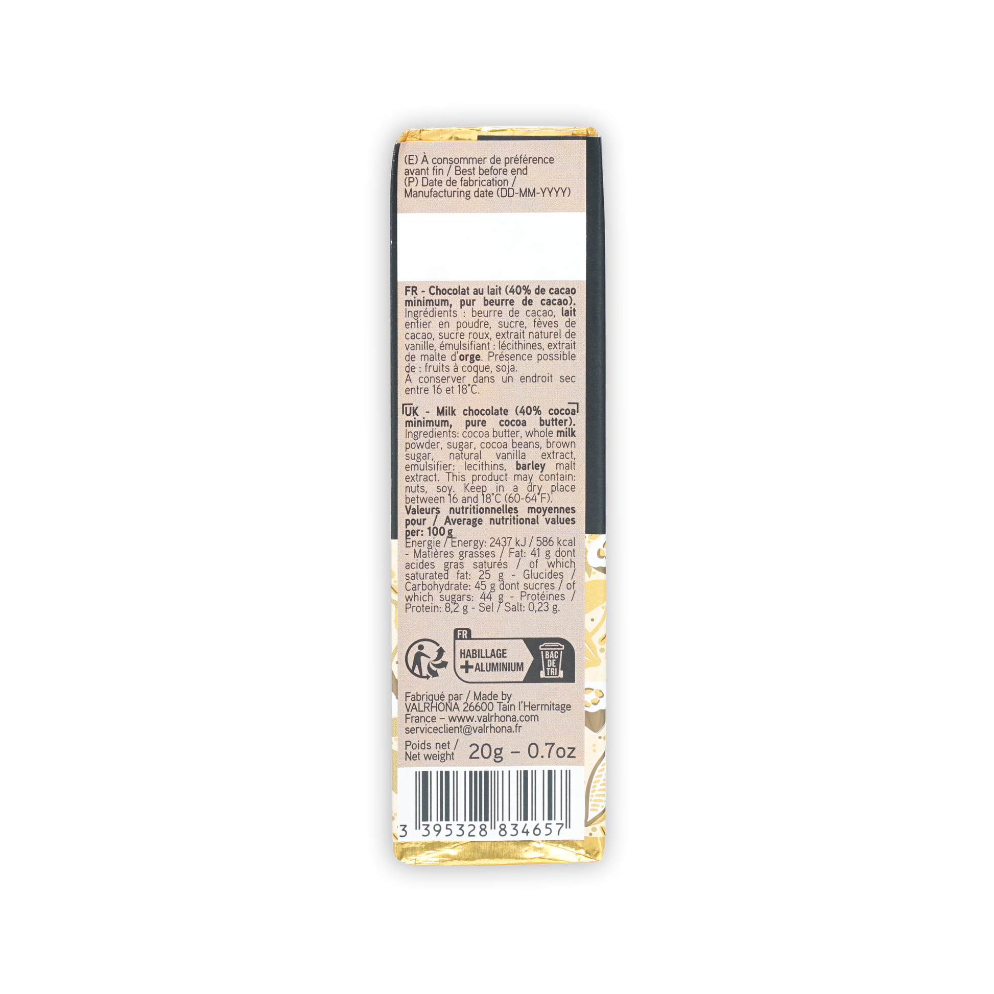 Ingredients: cocoa beans, sugar, cocoa butter, emulsifier: sunflower lecithin, natural vanilla extract.